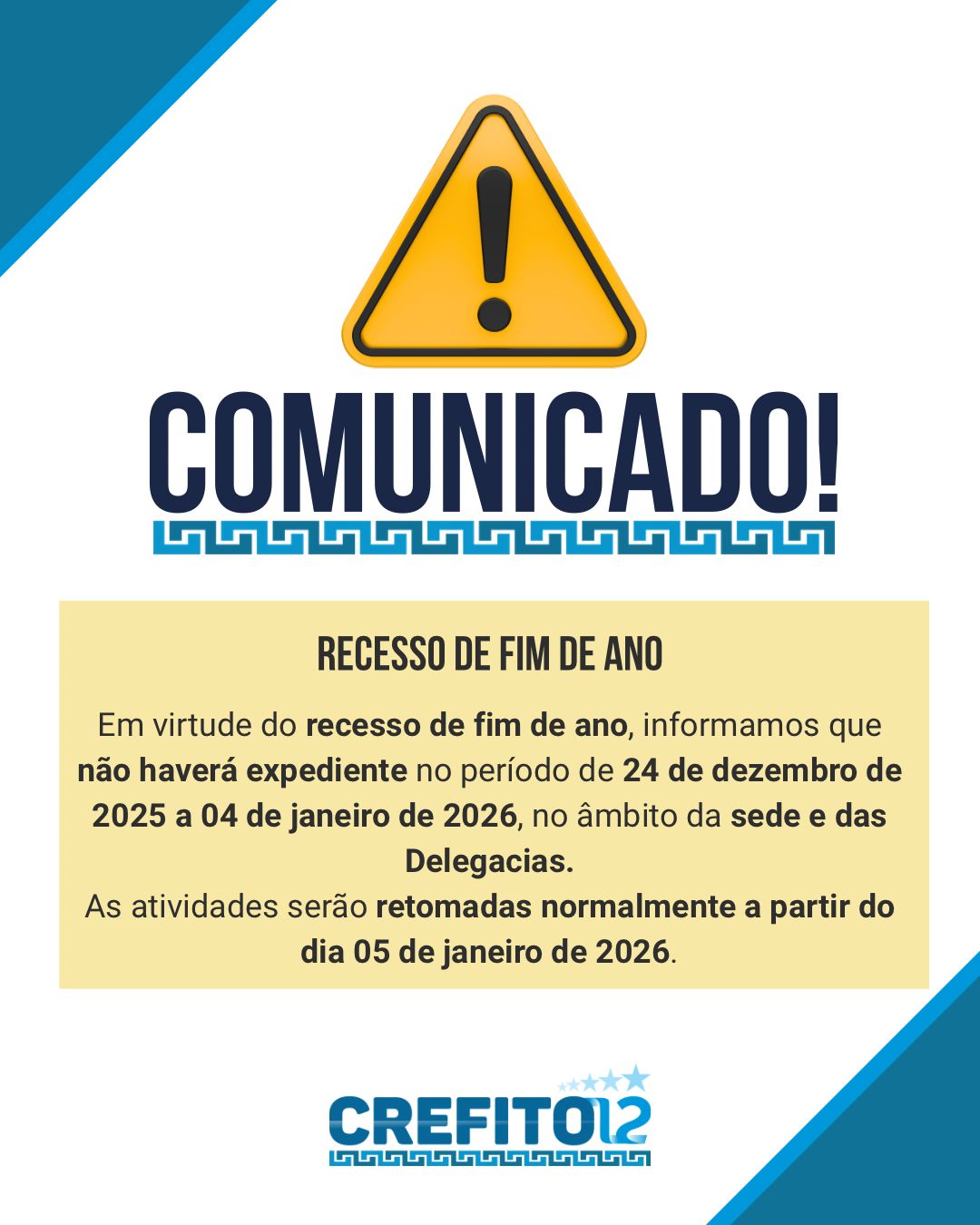 Recesso de fim de ano 23 de dezembro de 2025 / Ascom ⚠️ COMUNICADO | Recesso de fim de ano ⚠️ Em razão do recesso de fim…